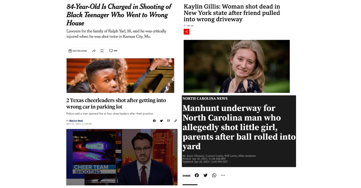 Knocking on a door, turning your car around in a driveway, or chasing a ball into your neighbor’s yard can get you shot now, apparently.