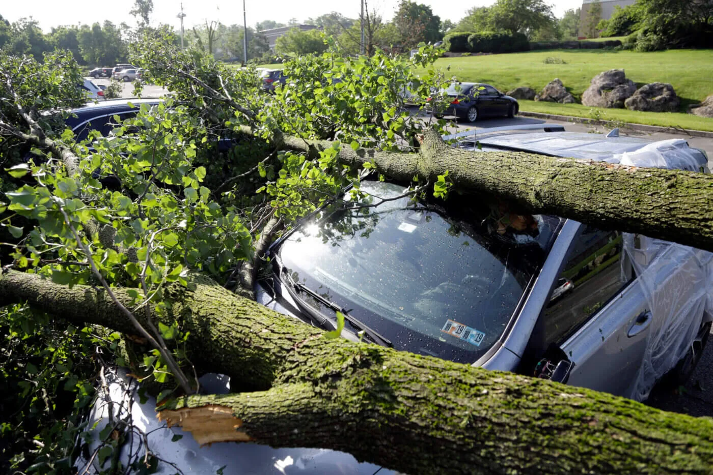 Downed tree limbs remain on cars outside a business Wednesday, May 29, 2019, in Morgantown, Pa. The National Weather Service says a tornado has been confirmed Tuesday in eastern Pennsylvania, where damage to some homes and businesses occurred, but there were no immediate reports of injuries. (AP Photo/Jacqueline Larma)