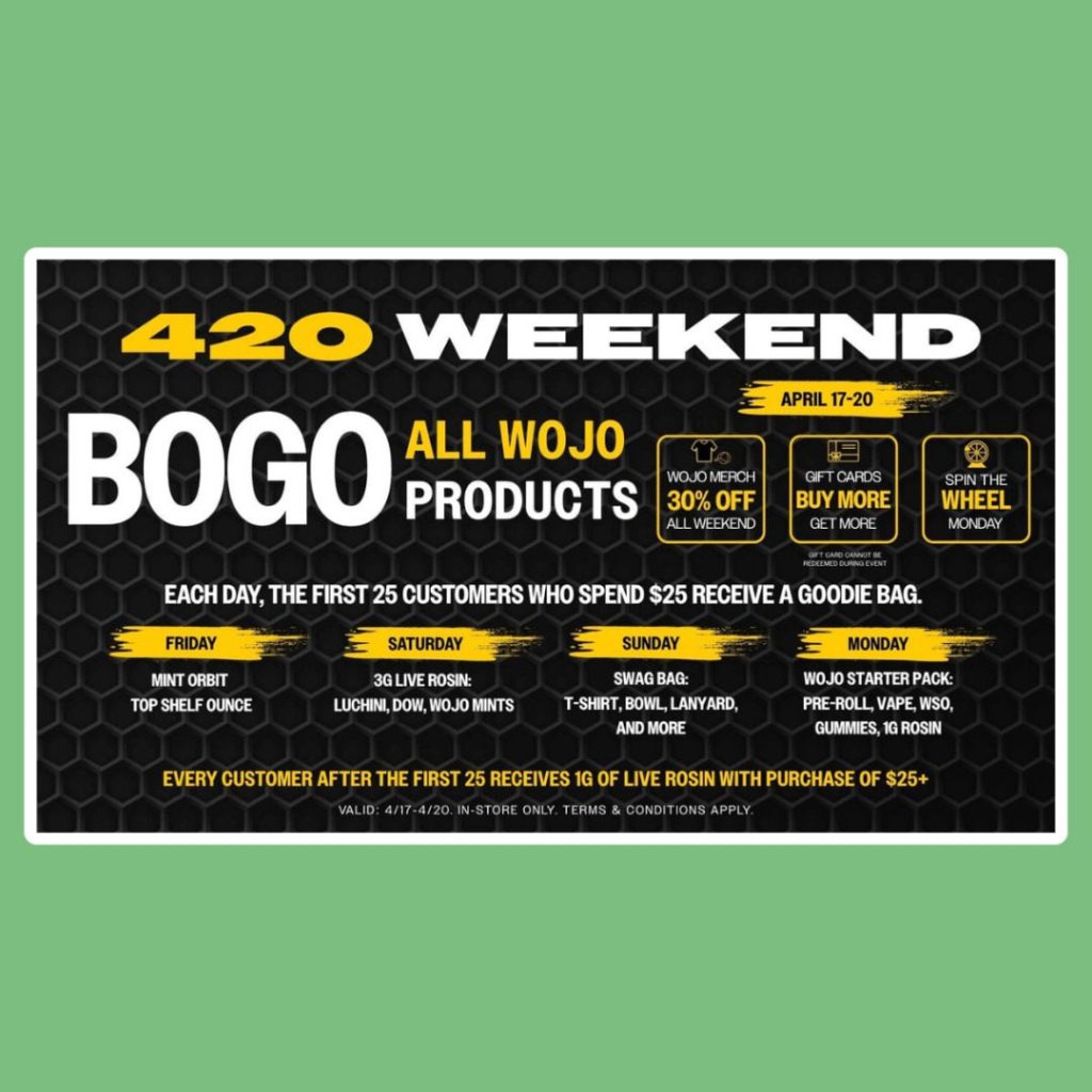 Wojo Cannabis Co. is going all-in for 420 with a buy-one-get-one-free deal on all house products, plus a rotating lineup of freebies for the first 25 customers from April 17-20.