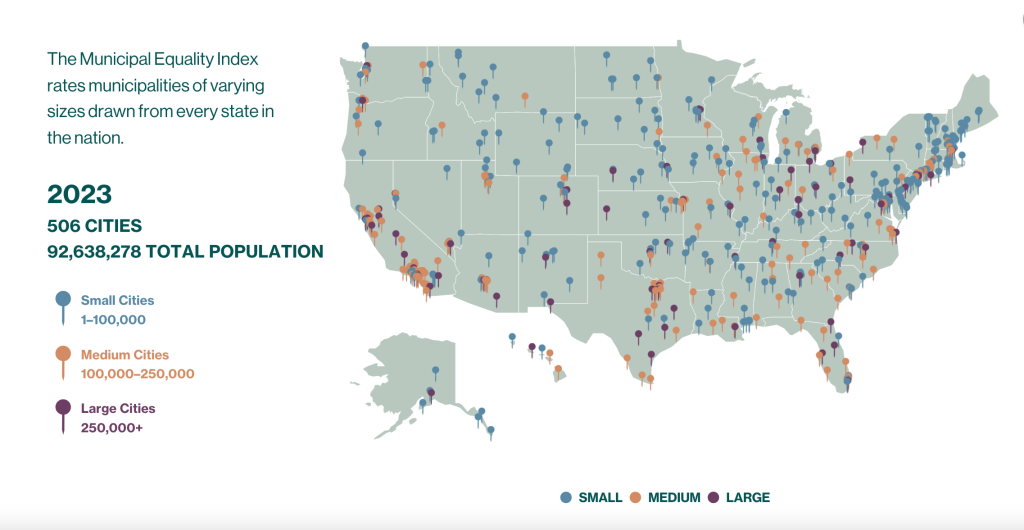 The MEI includes all 50 state capitals, the 200 largest cities in the United States, the five largest cities or municipalities in each state, the cities home to the state’s two largest public universities (including undergraduate and graduate enrollment), 75 cities and municipalities that have high proportions of same-sex couples and 98 cities selected by HRC and Equality Federation state groups members and supporters.