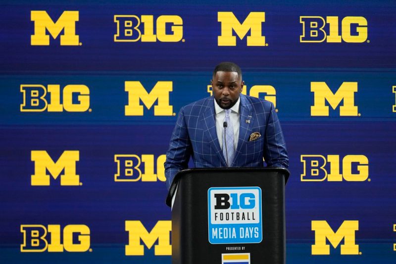 FILE – Michigan head coach Sherrone Moore speaks during an NCAA college football news conference at the Big Ten Conference media days at Lucas Oil Stadium, July 25, 2024, in Indianapolis. (AP Photo/Darron Cummings, File)
