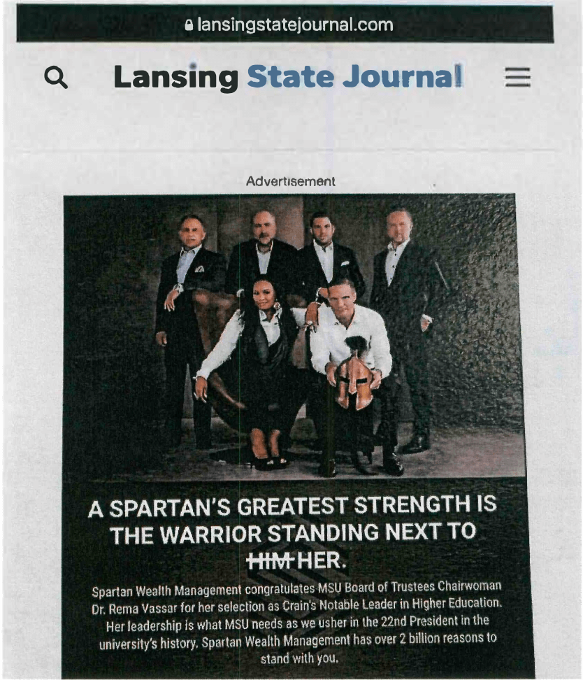 - In spring 2023, Dr. Vassar authorized her photo with former trustee Brian Mosallam and his Spartan Wealth Management group, to be used in advertising on behalf of his private business which appeared in media across the state, including the Lansing State Journal. The caption reads “A Spartan’s Greatest strength is the Warrior Standing Next to