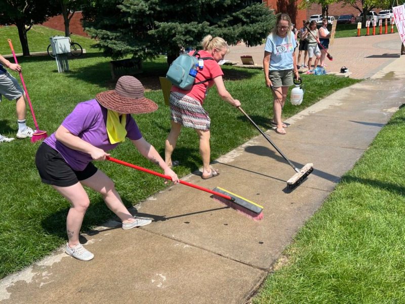 The group of parents, grandparents, teachers, and other community members, later grabbed brooms and mops, as they washed down the sidewalk in front of the historic Livingston County Courthouse, the same place where the approximately dozen white supremacist supporters gathered July 20, before marching through the downtown area.
