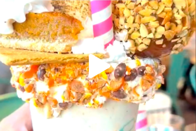 JoJo’s Pumpkin Patch Milkshake is truly a sight to see. It includes an entire slice of pumpkin pie on top, along with a taffy apple and other delicious fall flavored treats.