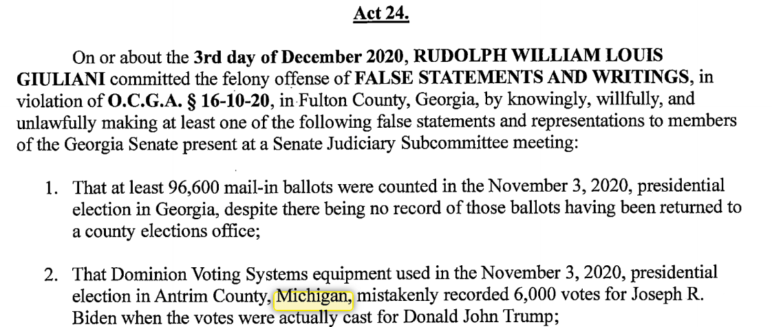 The next day, Giuliani also told lawmakers in Georgia that Dominion Voting Systems equipment used in Antrim County had mistakenly recorded 6,000 extra votes for Biden instead of Trump.