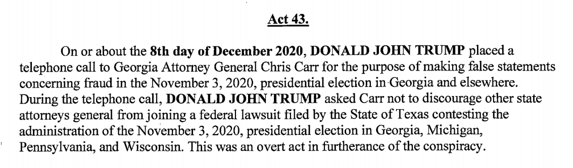 The indictment also mentions another call that Trump made to Georgia Attorney General Chris Carr, where Trump asked Carr to lie about voter fraud and “not to discourage” other attorneys general to contest the election results in Georgia, Pennsylvania, Wisconsin—and Michigan.