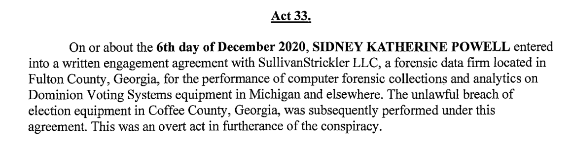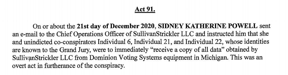 According to the indictment, several of the defendants who were charged this week had “corruptly conspired” to illegally access voting equipment and voter data—and in some cases actually got their hands on stolen election data and software, including in the state of Michigan.