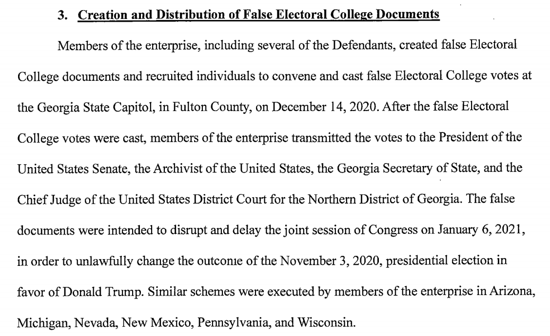 Several of the defendants charged in this week’s indictment allegedly created false Electoral College documents, and recruited individuals to convene and cast false electoral votes at the Georgia State Capitol. Those fake votes were then sent to the US Senate and other agencies, specifically in an attempt to “disrupt and delay” the joint session of Congress tasked with certifying the presidential election results on Jan. 6, 2021.