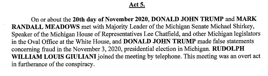 Two weeks after Election Day, Trump, his former chief of staff Mark Meadows, and Trump attorney and former New York City Mayor Rudy Giuliani met with former Michigan Senate Leader Mike Shirkey and former House Speaker Lee Chatfield at the Oval Office—where Trump made “false statements concerning fraud” in the 2020 election, according to the indictment.