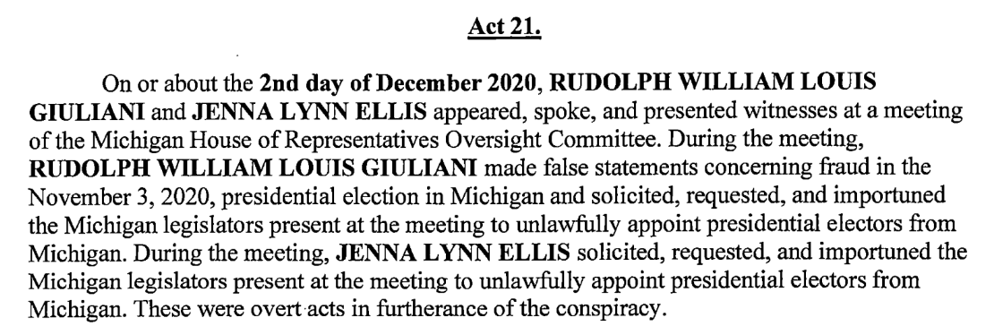 About two weeks later, Giuliani and Jenna Ellis, another Trump attorney, also provided “false statements concerning fraud” to the Michigan House and requested that state lawmakers illegally appoint a fake slate of presidential electors, according to the latest indictment.