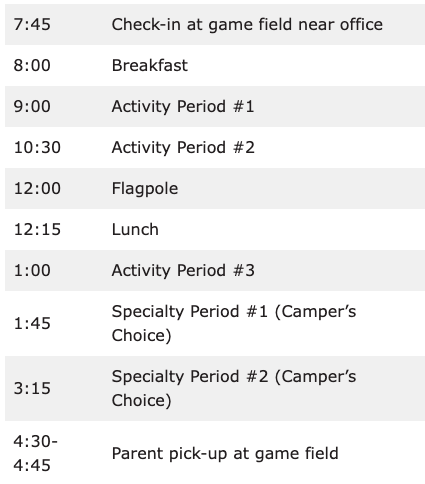 Most camps have three time options: Morning (9 a.m.-12 p.m.), afternoon (1-4 p.m.), and Day Camp (9 a.m.-4 p.m.).