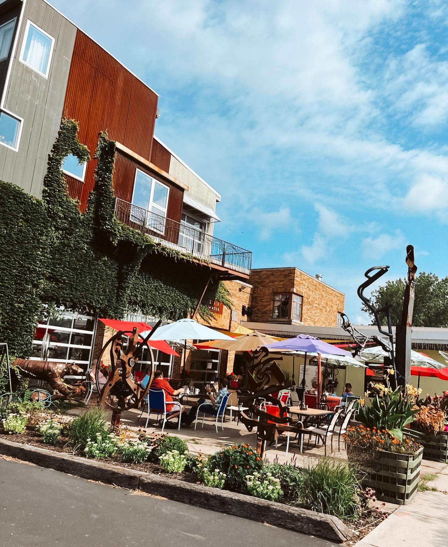 Upon entering the cafe, you’ll immediately be drawn to its rustic decor, lounge areas, and locally sourced artwork. Its outside seating area boasts colorful umbrellas and statues.