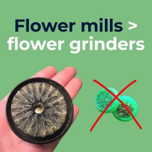 The latest in bud-breaking technology is called a flower mill—and instead of pulverizing your weed into a powder by repeatedly stabbing it with those pointy little teeth, a flower mill gently mashes your bud into a fine (but not too fine) smokable format.