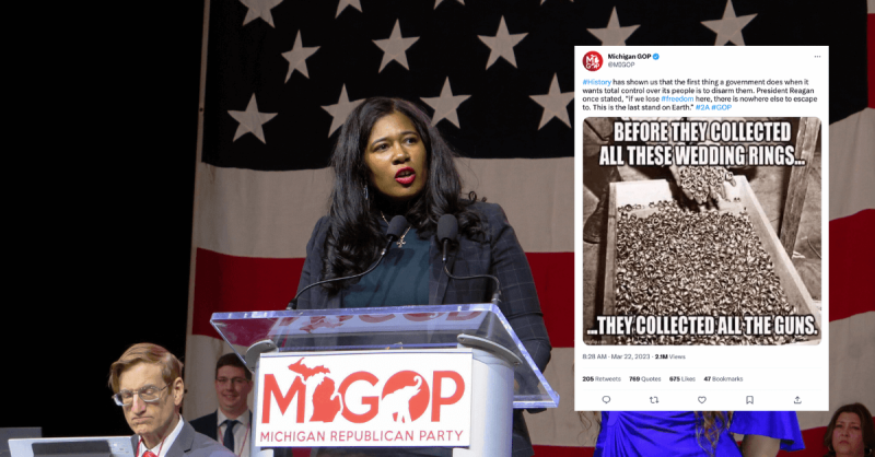 The election denying extremist who is in charge of the Michigan Republican Party has cooked up some offensive new scare tactics to oppose proposed gun safety legislation in Michigan—but they’re just more bizarre conspiracy theories.
