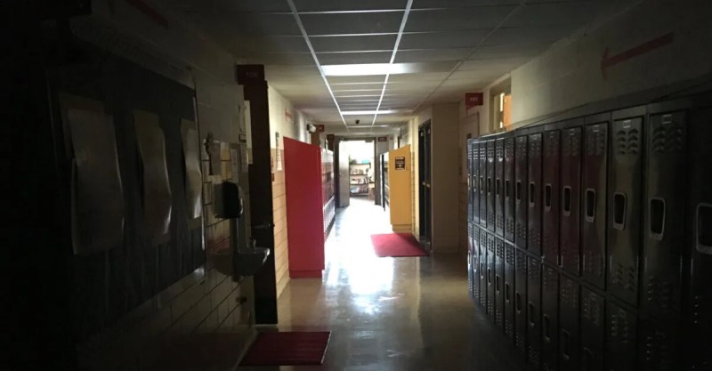An empty hallway is shown at David Ellis Academy in Detroit, Monday, Feb. 8, 2021. (AP Photo/Mike Householder)