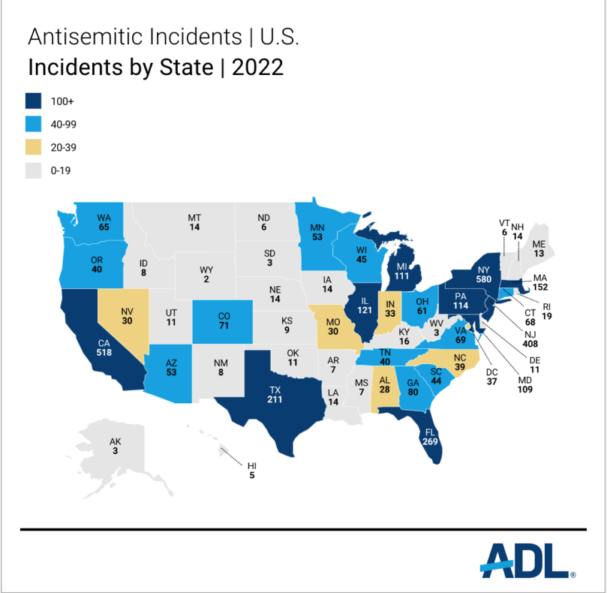 “By comparison, during the same period in 2022, ADL received preliminary reports of 64 incidents, including four that were Israel-related,” stated the organization.