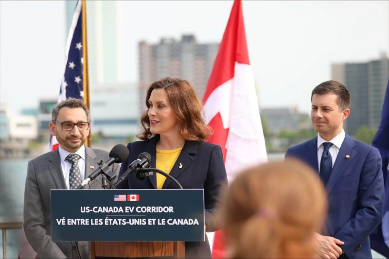 Gov. Gretchen Whitmer joined U.S. Transportation Secretary Pete Buttigieg, Canadian Minister of Transport Omar Alghabra, and Detroit Mayor Mike Duggan on Tuesday to announce the construction of the first binational EV corridor between the U.S. and Canada.