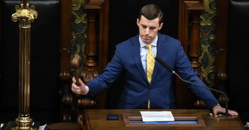 Michigan House Speaker Lee Chatfield bangs the gavel in Lansing on April 24, 2020. (Matthew Dae Smith/Lansing State Journal via AP, File)