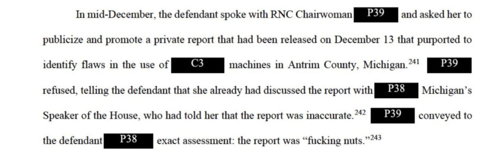 The new filings also detail an interaction between Trump and then-Republican National Committee Chair Ronna McDaniel, where the former president reportedly asked for McDaniel to share a widely debunked report about malfunctioning voting machines in Antrim County.