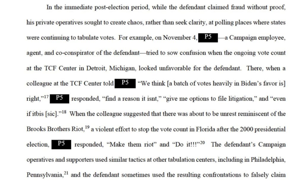When the colleague suggested that there was about to be unrest reminiscent of the Brooks Brothers Riot, a violent (and successful) effort to stop a recount in Florida after the 2000 presidential election, the campaign staffer responded: “Make them riot” and “Do it!!!,” the filing states.
