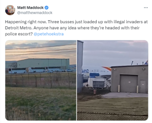 “Happening right now,” wrote Maddock. “Three busses [sic] just loaded up with illegal invaders at Detroit Metro. Anyone have any idea where they’re headed with their police escort?”