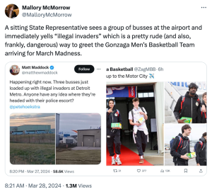 “A sitting State Representative sees a group of busses [sic] at the airport and immediately yells “illegal invaders” which is a pretty rude (and also, frankly, dangerous) way to greet the Gonzaga Men’s Basketball Team arriving for March Madness,” she posted.