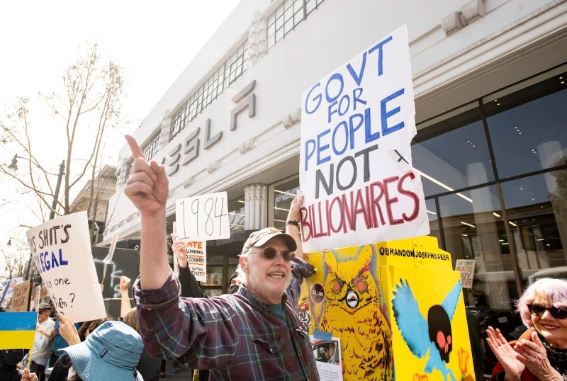 Mark Crosley holds up a sign and yells during a protest outside a Tesla dealership in San Francisco, Saturday, March 15, 2025. (AP Photo/Josh Edelson)