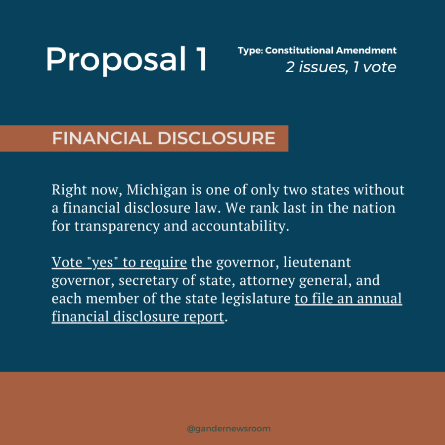 Proposal 1’s financial disclosure issue addresses conflicts of interest in the state government. A new subsection to the Constitution would be added, requiring elected officials to file financial disclosure reports—including details about all sources of income (and promised income) for state lawmakers, the governor, the secretary of state and the attorney general.
