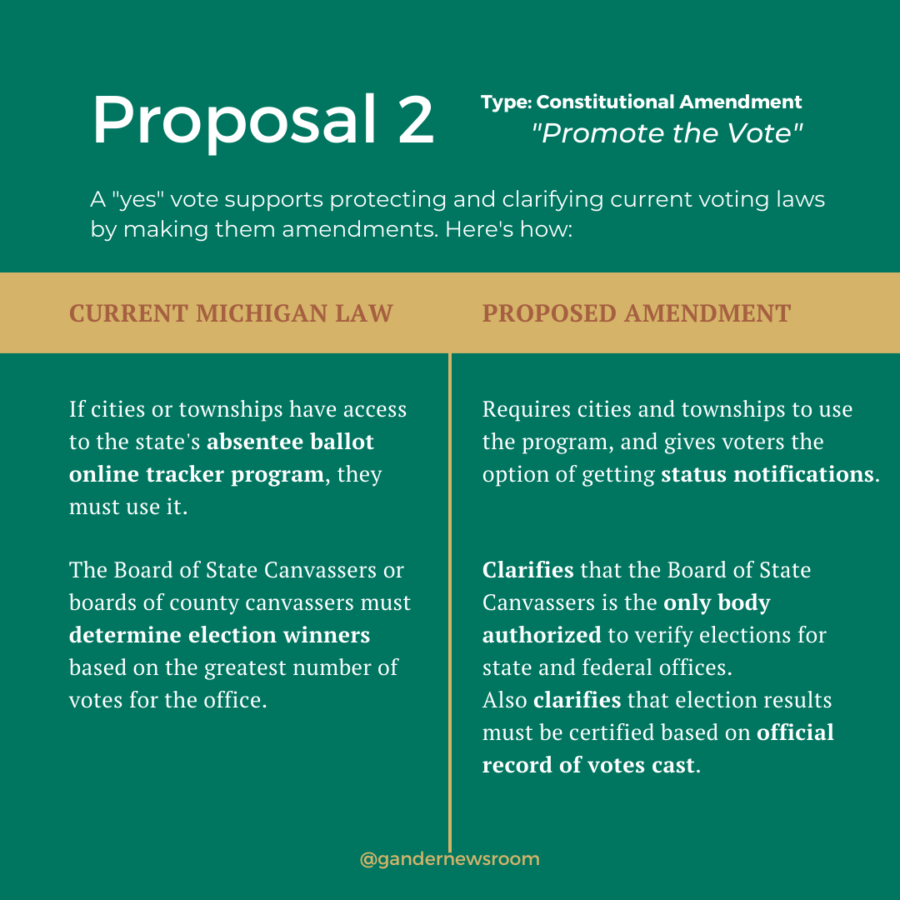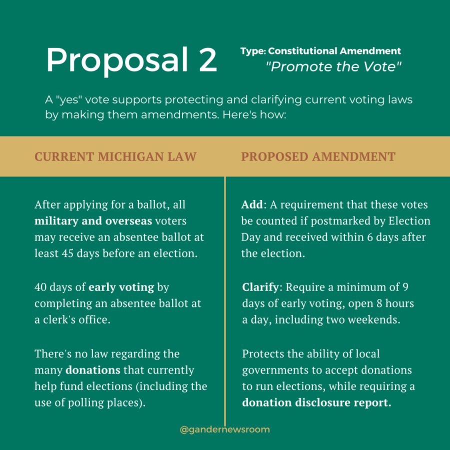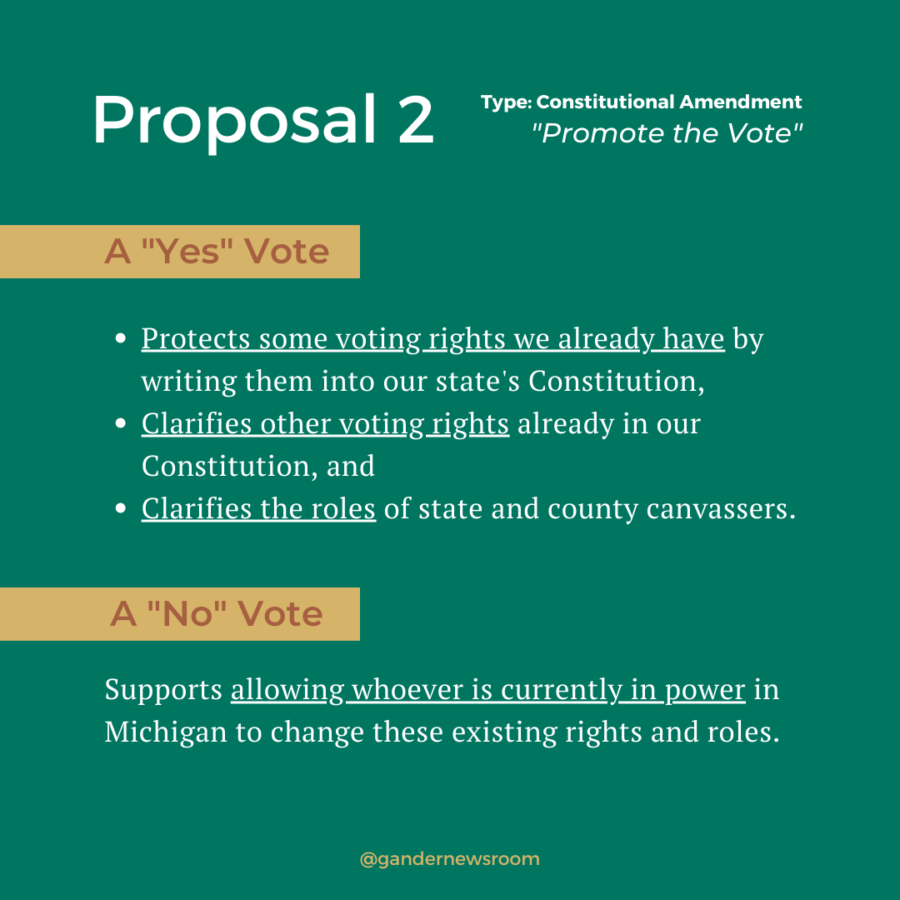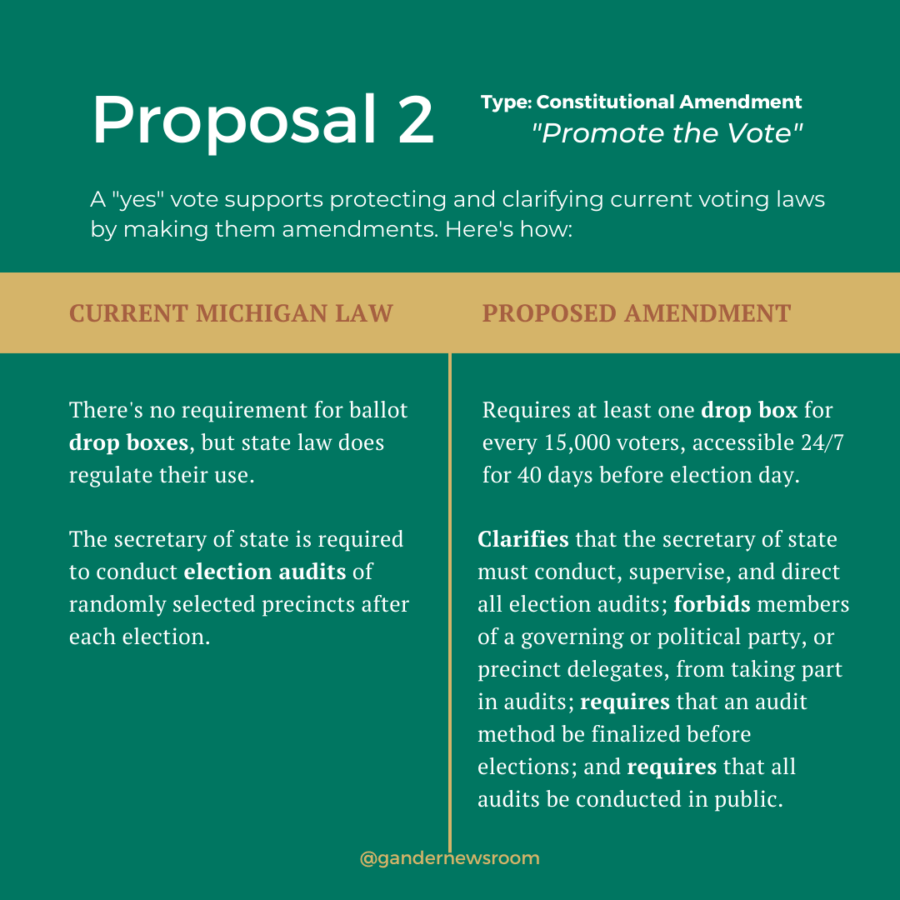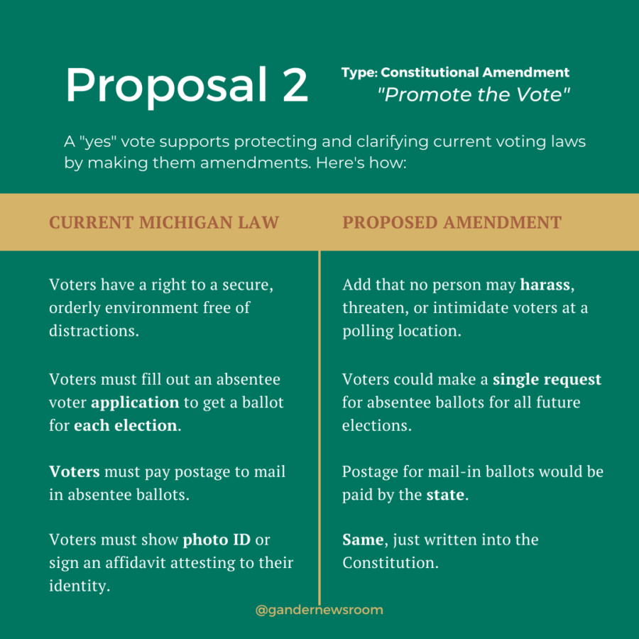 This initiative, otherwise known as “Promote the Vote,” was introduced by a coalition of Michigan voting rights groups, including the League of Women Voters and the American Federation of Teachers. The overarching idea: Make it easier for Michiganders to vote while protecting voting from outside influence, by locking some of our current voting rights and rules into the state’s Constitution.