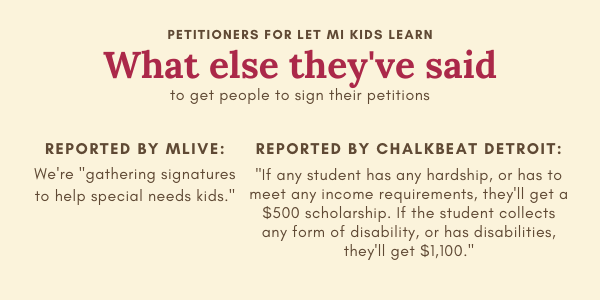 Later that day, the family was approached by a woman attending the fair, who said she’d overheard what Robinson was saying and thought she may have misunderstood the petition. The stranger explained that the petition was not supporting scholarships to colleges, but instead was Let MI Kids Learn, a voucher program that would divert millions of dollars in public school funds to private and charter schools.
