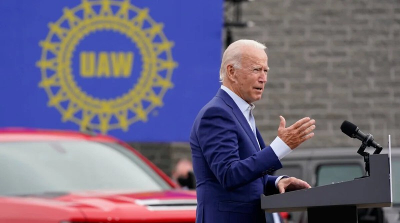 President Joe Biden—then just a presidential candidate—speaks at the UAW headquarters in Warren in 2020. (AP Photo/Patrick Semansky)