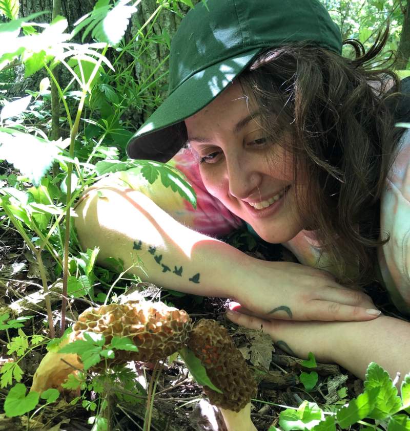 We’re in the woods of Southwest Michigan, following a little deer path through the foliage, ducking under branches and climbing over logs. Where, exactly? Angelina won’t say on the record. Many mushroom hunters keep their spots a secret. What I can tell you is that out where we are, our only competition is the local deer. Sure, you can find mushrooms in public parks, but so can everyone else, and with the hobby increasing in popularity—especially with young adults—I get why Angelina wants to keep her spot to herself.