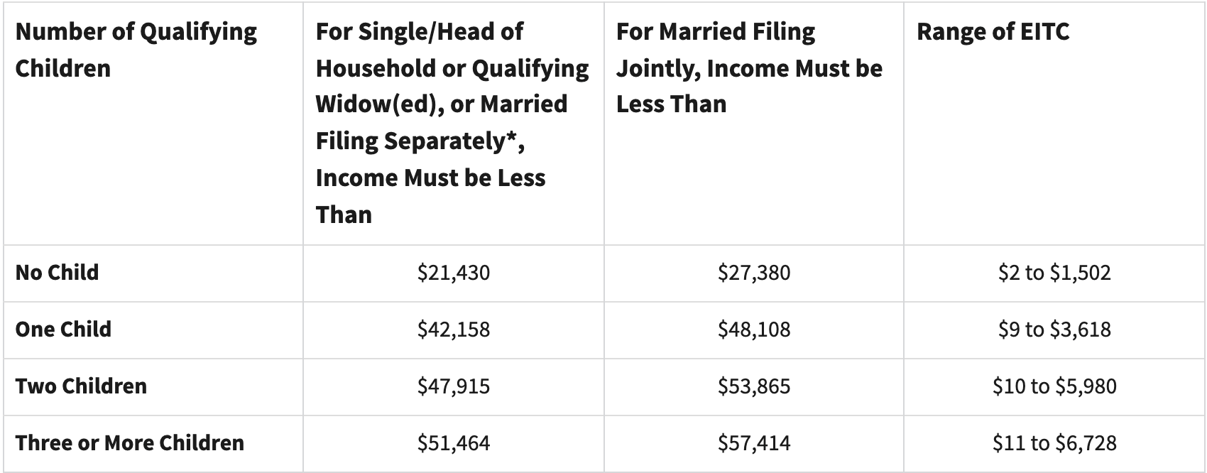 Here are the current income limits to qualify for the EITC, per the IRS. It’s worth noting that the average amount of the credit can vary widely based on income and the number of children in the household.
