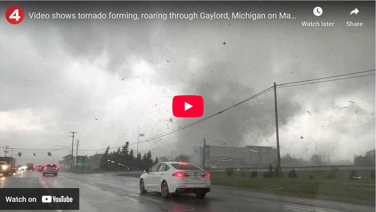 Many Michiganders will recall a storm system on May 20, 2022, that resulted in a tornado in the small town of Gaylord. This video shows the twister’s development, beginning with swirling clouds that ultimately form a funnel and tear through the town, sending debris and power lines into the air.