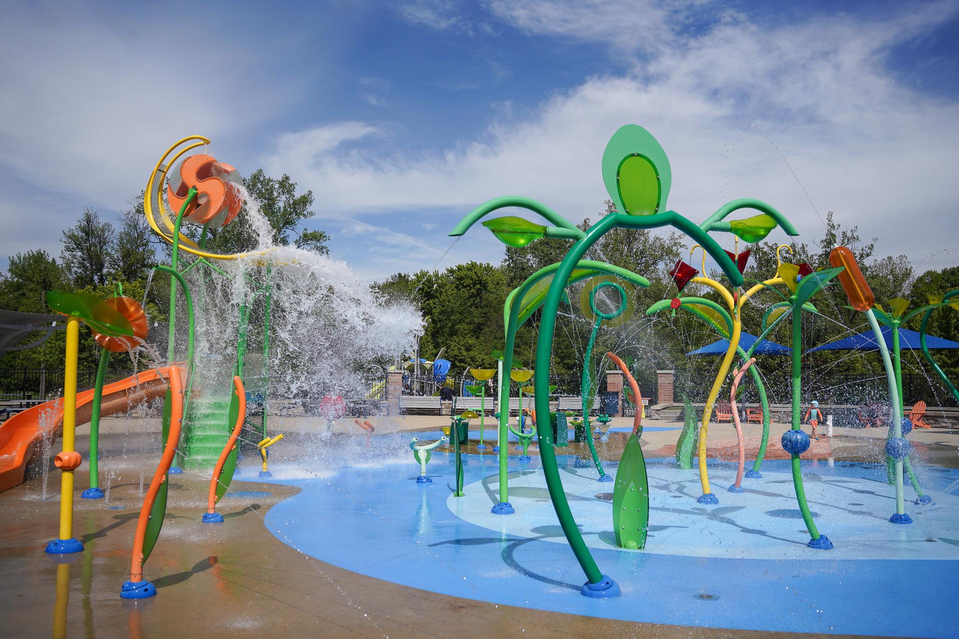Water fountains, a slide, and sprayers at the Dodge Park splash pad in Sterling Heights, Michigan. (Image courtesy of Dodge Park)