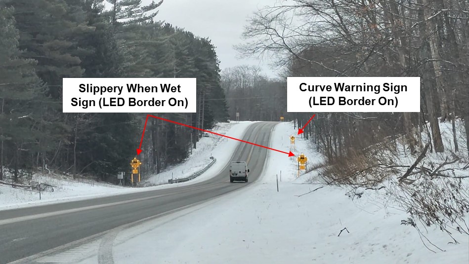 LED lights on the borders of “slippery when wet” and “curve” signs were programmed to automatically activate in 30-minute cycles during adverse conditions.
