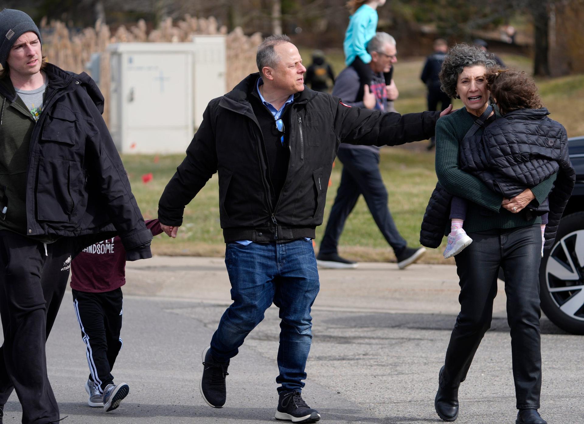 Leah Trosch, of Franklin, right, carries her 4-year-old granddaughter Kayla Trosch away from Shenandoah Country Club after the attack on Temple Israel in West Bloomfield on Thursday, March 12, 2026. (USA Today Network)