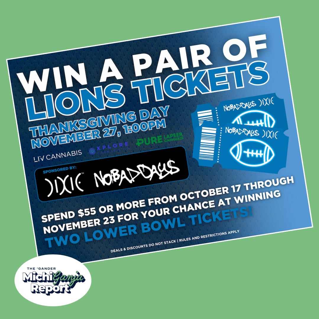 Three dispensaries—LIV Cannabis, Xplore, and Pure Lapeer—are giving customers a shot at two tickets to see the Lions take on the Green Bay Packers on Thanksgiving Day at Ford Field.